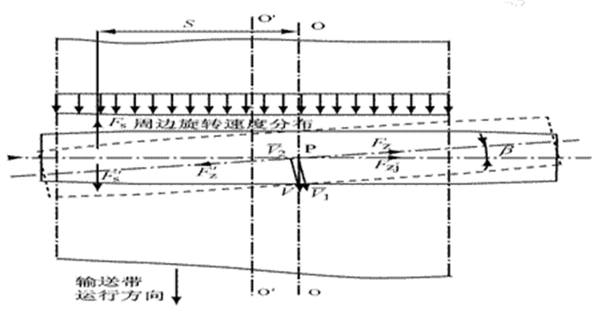 假設輸送帶向左側跑偏,如圖所示,輸送帶接觸到托輥左邊錐體部分后,因錐體周邊速度與托輥中央速度有一定的速差,托輥給輸送帶一個滑動摩擦力Fs ,同時輸送帶給托輥一個反作用力Fs ′, 它與中央樞軸間存在力臂S , 使滾筒受到一個旋轉力矩M :
